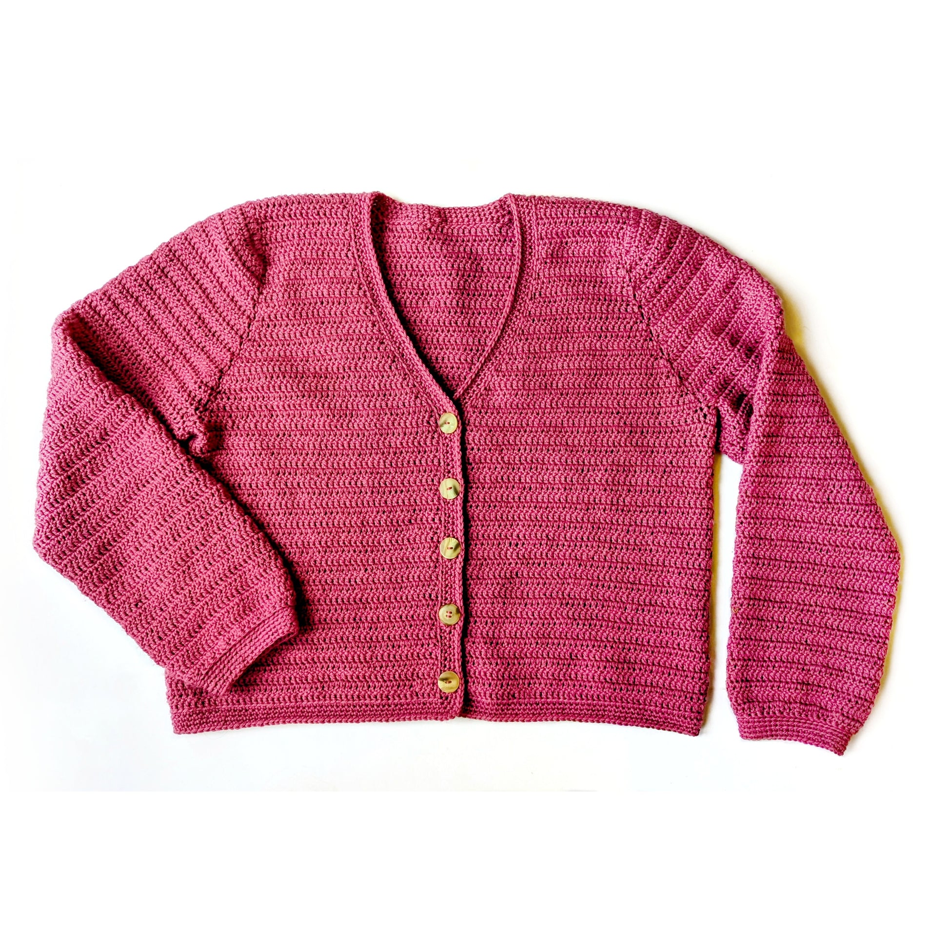 The cardigan has 14cm of positive ease. If you are between sizes you can choose to size down for a more snug fit with 9cm ease, or size up for 19cm ease and a more oversized look. Being top down, the length of the body and sleeves are easily adjustable.