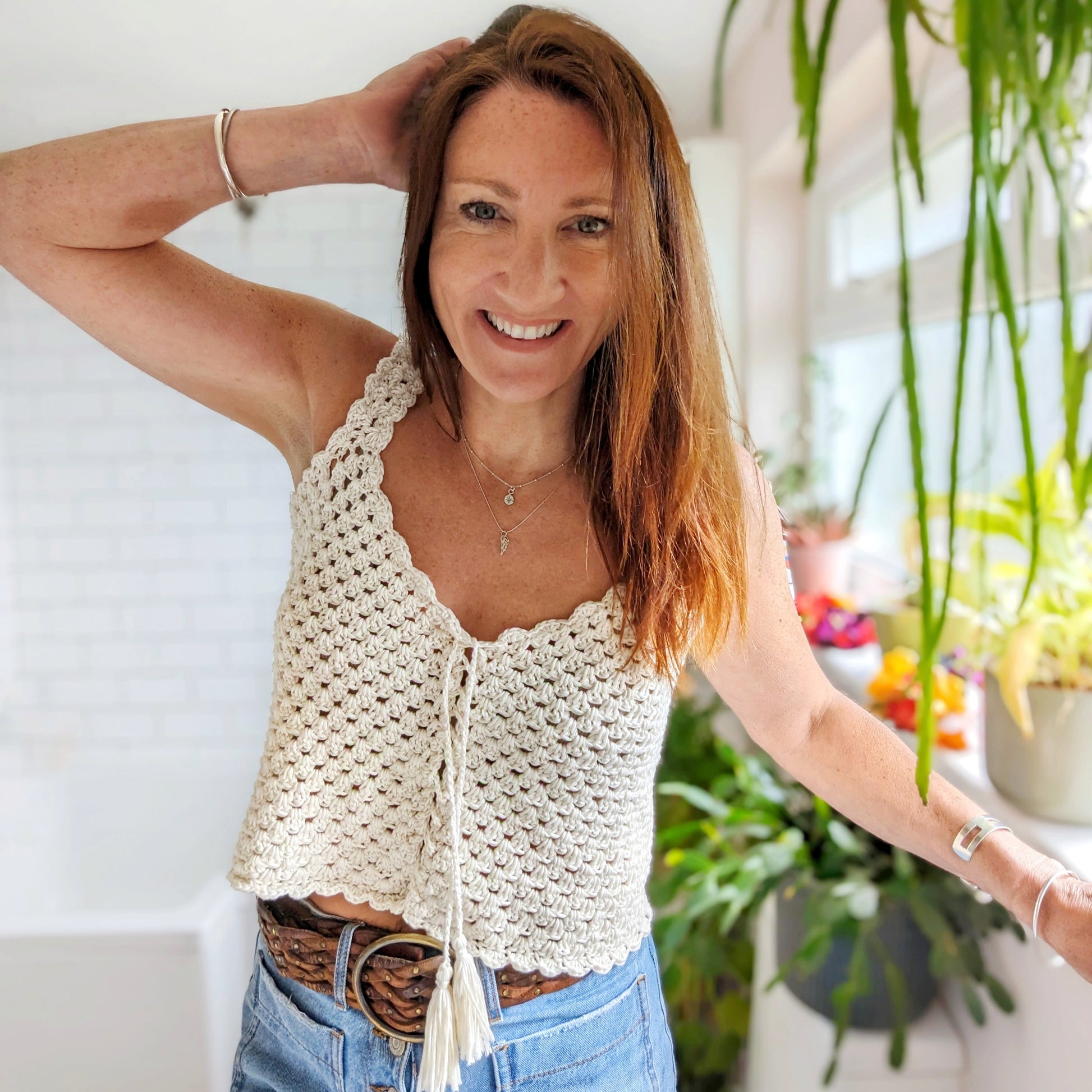 This flattering top-down vest will be a staple in your summer wardrobe. Make it as a simple V neck, or with a lace-up front for a boho vibe. Worked in Granny stitch, this top could easily be worked in fun summery stripes.