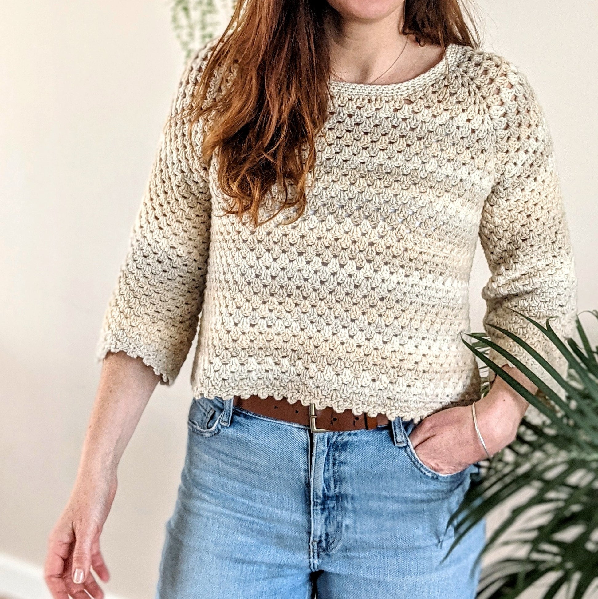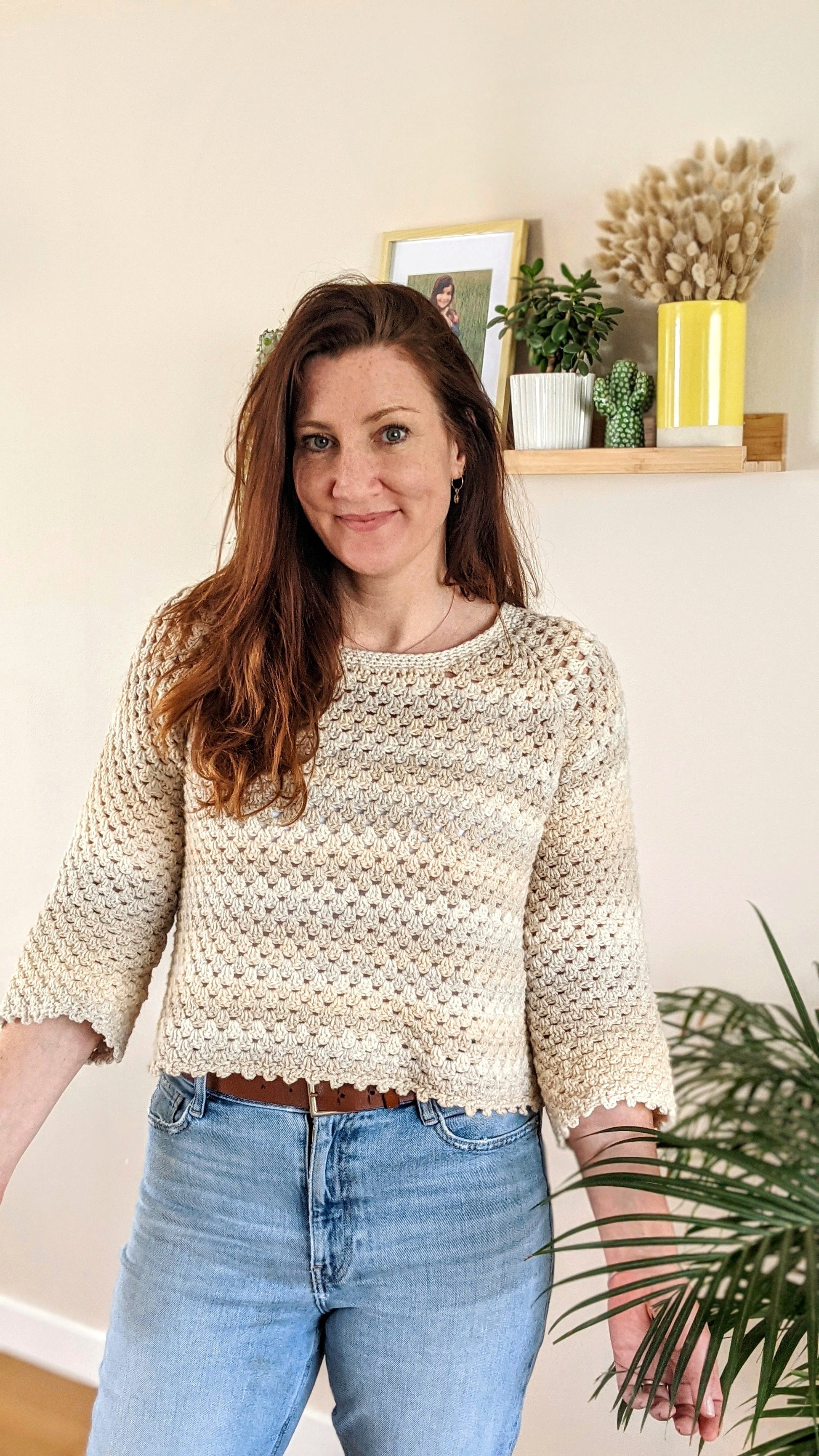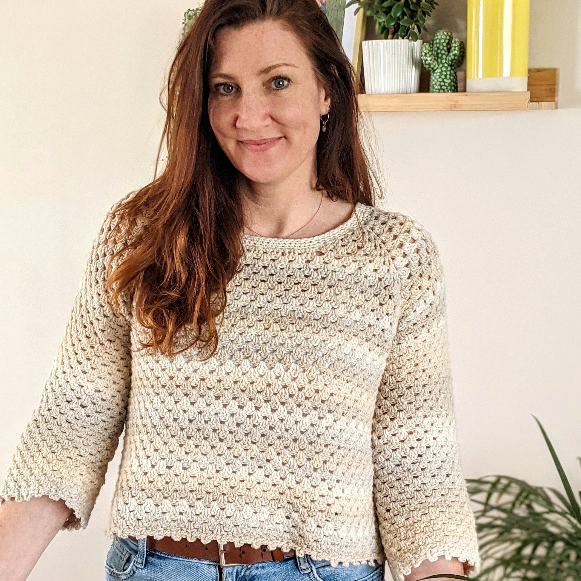 Made in DK Cotton yarn with a scooped neckline, 3/4 length sleeves and a slightly cropped body, it is the perfect addition to your summer wardrobe. The drapiness of the lightweight cotton yarn combined with the picot trim gives it that perfect summery feel.