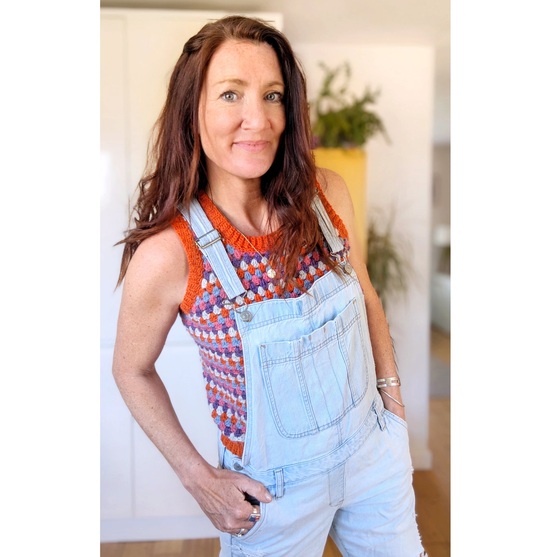A Granny stitch tank top, made from the top down, meaning it can be easily customised to fit however you like. Make it plain or striped or use a colour changing yarn for easy colour work.