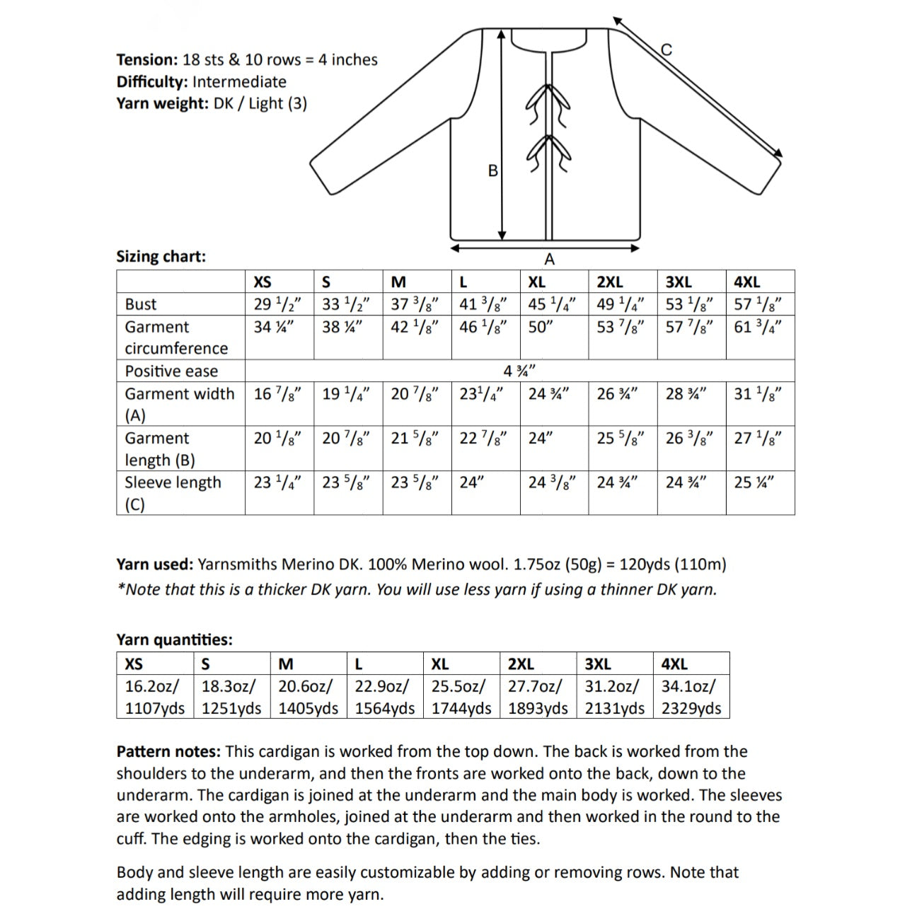 She has 12cm of positive ease, for a more jacket style fit. If you are between sizes you can choose to size down for a more snug fit with 7cm ease (see Fuschia pink version) or size up for 17cm ease and a more oversized look (see Khaki version). Being top down, the length is easily adjustable - so try making it oversized and cropped for extra sass!